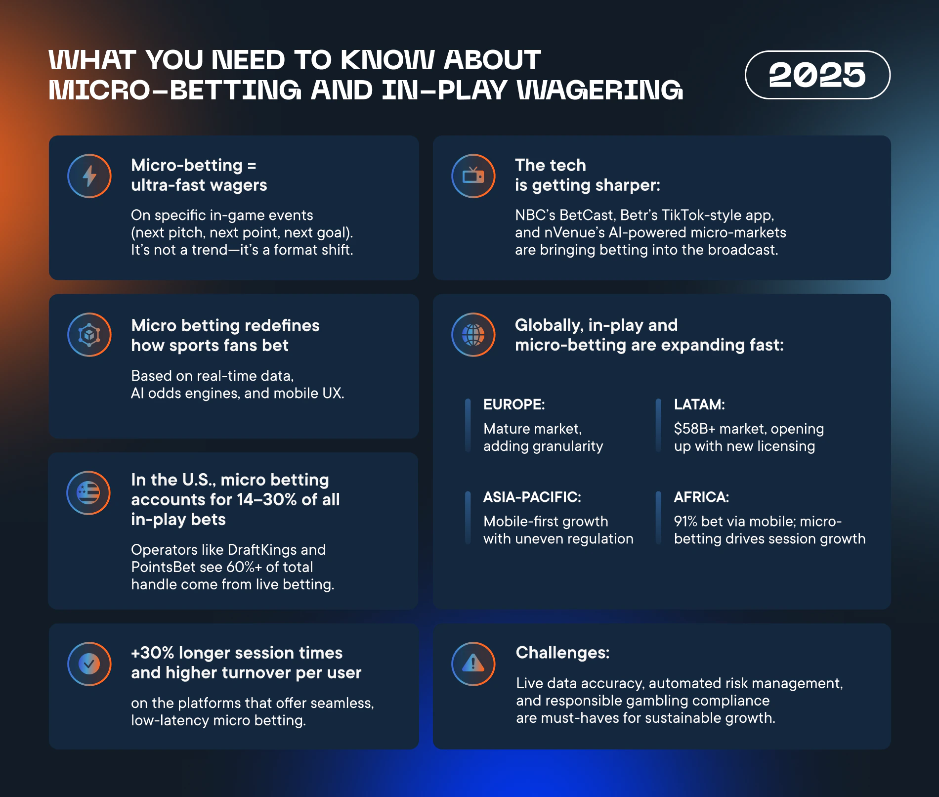 Since microbetting depends on latency, operators have turned to AI-based oddsmaking, real-time data feeds, and cloud-native infrastructure to enable wagers that can be resolved in seconds. The tech is complex; the interface is not. In fact, that simplicity (tap, swipe, confirm) has become its biggest appeal.